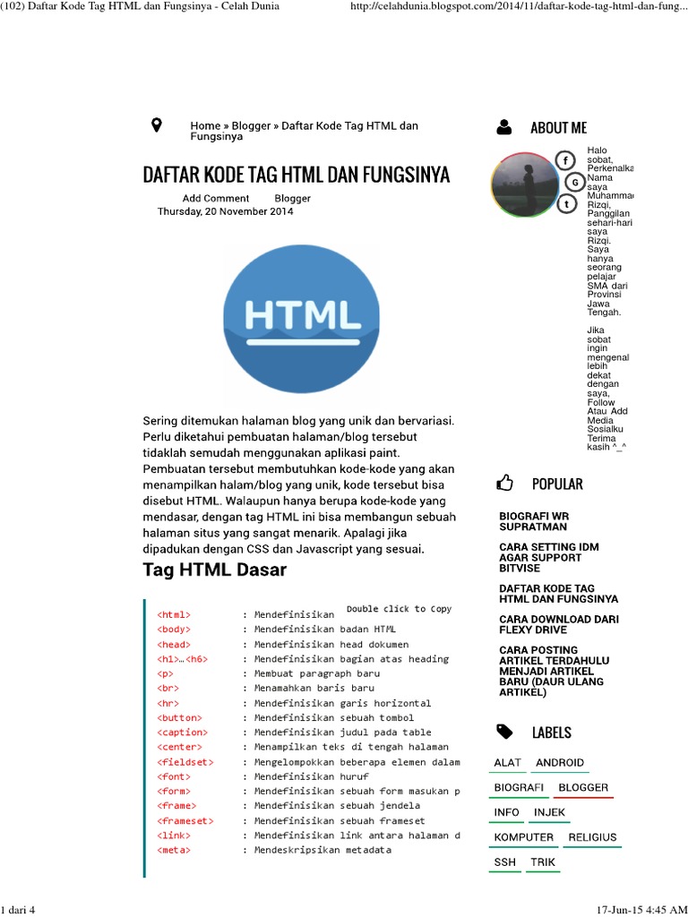 Sebenarnya anda hampir tidak memerlukan software apapun untuk menuliskan kode html, dan banyak desiner web menyatakan bahwa website terbaik menggunakan notepad! Kode sumber dan kode objek terkadang disebut sebagai versi before (sebelum) dan after (setelah) dari program komputer yang dikompilasi. Css dan javascript terletak didalam file html. Penulisan kode html selalu dimulai dengan deklarasi doctype, lalau menuliskan tag <html> dan di dalamnya terdapat tag <head> dan <body>. Baris kode di atas akan menerapkan background dengan warna biru, paragraf berukuran 20px, dan 'medium blue' font ke dalam satu halaman html. Referensi kode warna html dibawah berdasarkan sumber dari w3schools yang aku tambahkan dengan kode warna rgb. Situs web semantik telah terbukti lebih baik. Disebut hypertext karena kita dapat membuat text menjadi link yang dapat berpindah dari satu halaman ke halaman lainnya. Disebut markup language karena bahasa html menggunakan tanda (mark) Sebagai catatan, semua kode html harus ditulis didalam tag html. Tanpa panjang lebar langsung saja inilah beberapa tag html dasar yang sering diaplikasikan untuk mendesain website beserta fungsi dan contoh penggunaannya. Jadi setiap anda membuka website apapun dengan menggunakan. Andika siswoyo dan joko susilo (bukan nama sebetulnya), kedua nama ini ada di dalam tag paragraf.